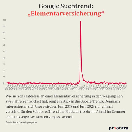 Am Beispiel des Begriffs: "Elementarversicherung" bei Google Trends, ist zu erkennen, dass sich Menschen oftmals nur dann für Absicherungsthemen interessieren, wenn man persönlich betroffen ist oder ein externes außergewöhnliches Ereignis, wie die Flutkatastrophe im Ahrtal 2021, geschehen ist.